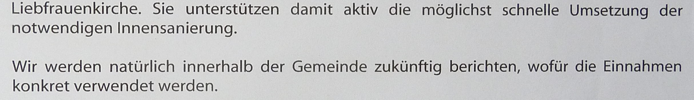Im Mai 2025 las ich dann im oben erwähnten vollständigen PGR-Beschluss mit großem Erstaunen und großer Verärgerung, dass der Bau mit e. V. Finanzierungszusagen für die Ausstattung der Liebfrauenkirche mit Medientechnik machte. Dafür hätte unsere Familie niemals gespendet. Wer Medientechnik finanzieren will, sollte auch für Medientechnik sammeln. Ich fragte ein mir bekanntes Mitglied des Bau mit e. V., wer den Verein führe. Es hatte keine Ahnung. Ich erfuhr weiterhin, dass es über mehrere Jahre keine Einladung zu einer Mitgliederversammlung erhalten hatte.