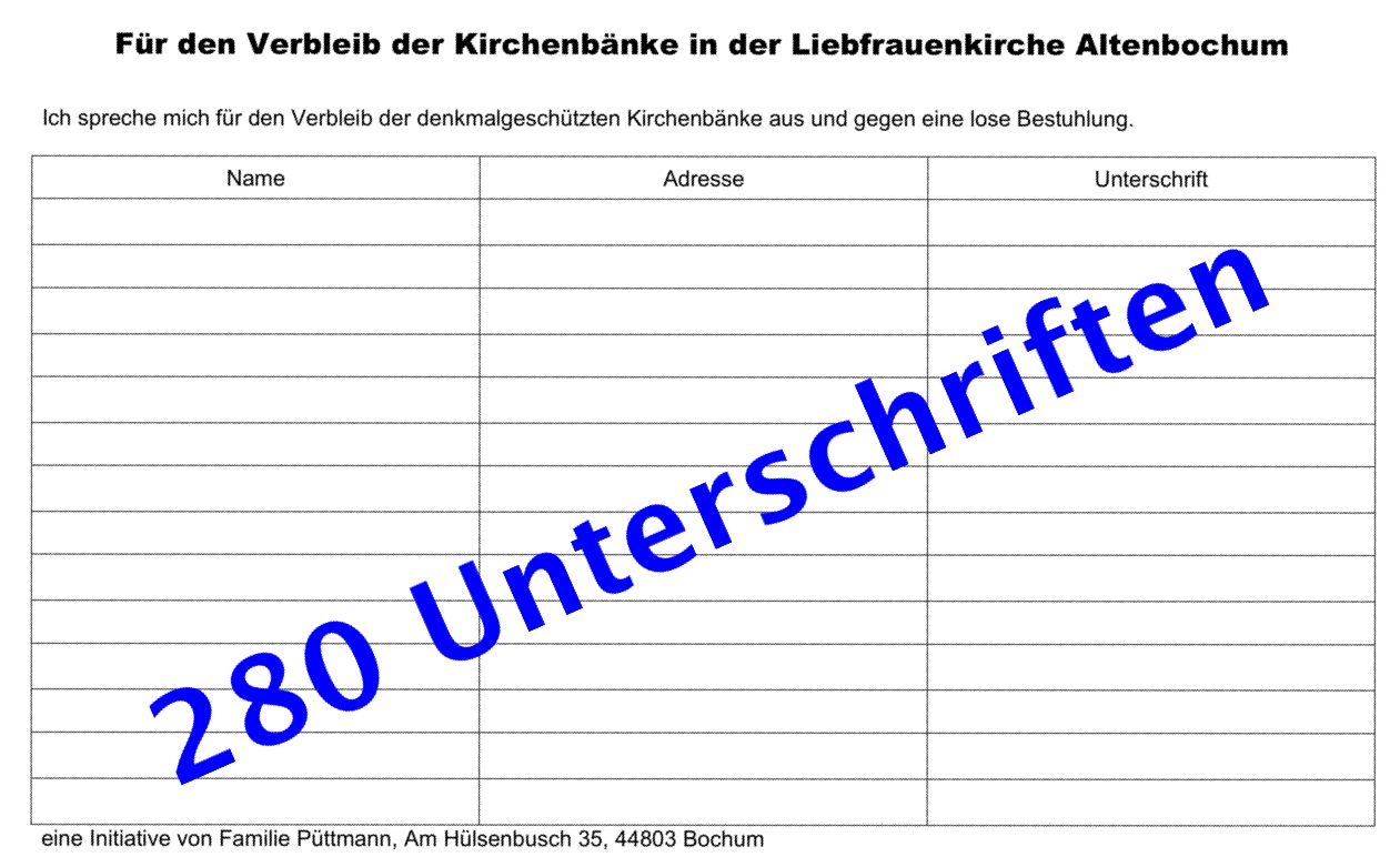 Vor und nach den Palmsonntags- und Ostermessen habe ich zusammen mit zwei meiner Kinder Unterschriften für den Verbleib der Kirchenbänke gesammelt. Nachträglich kamen noch ein paar weitere Unterschriften hinzu, so dass wir dem Pfarrgemeinderat und dem Pastoralteam am Ende über 280 Unterschriften vorlegen konnten.
